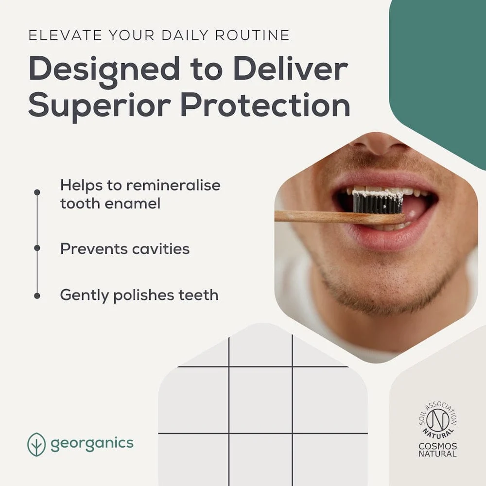 Experience the future of oral care with Georganics Fresh Mint Toothpaste, formulated with a powerful combination of hydroxyapatite, fluoride, and erythritol. This advanced blend is designed to deliver superior protection, helping to remineralise tooth enamel, prevent cavities, and gently polish teeth.