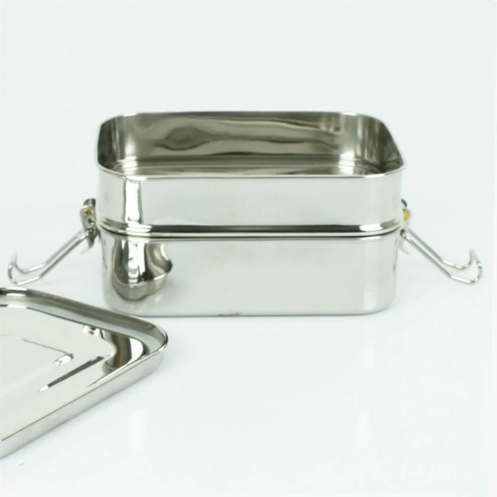 Ideal for taking a waste free 'on-the-go' balanced lunch from home, the 'Buruni' stainless steel lunch box consists of two separate tiers so is ideal for taking a savoury salad or sandwich, plus fruit or a snack to work in one neat container. Features include smooth folded edges, levered locking clips at each end for extra pressure during closure, and a handy silicone seal around the lid which makes it more leak resistant than the standard A Slice of Green containers.