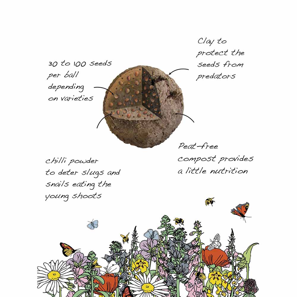 Created by conservation scientists and 100% British made, Seedball is a unique innovation to help more people grow bee and butterfly-friendly wildflowers. They are manufactured in-house using a mixture of UK-native seeds, clay, peat-free compost and chilli powder to create a protective casing against seed predators (e.g. birds and ants).